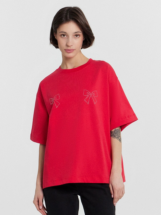 Футболка женская красная с бантиками из страз