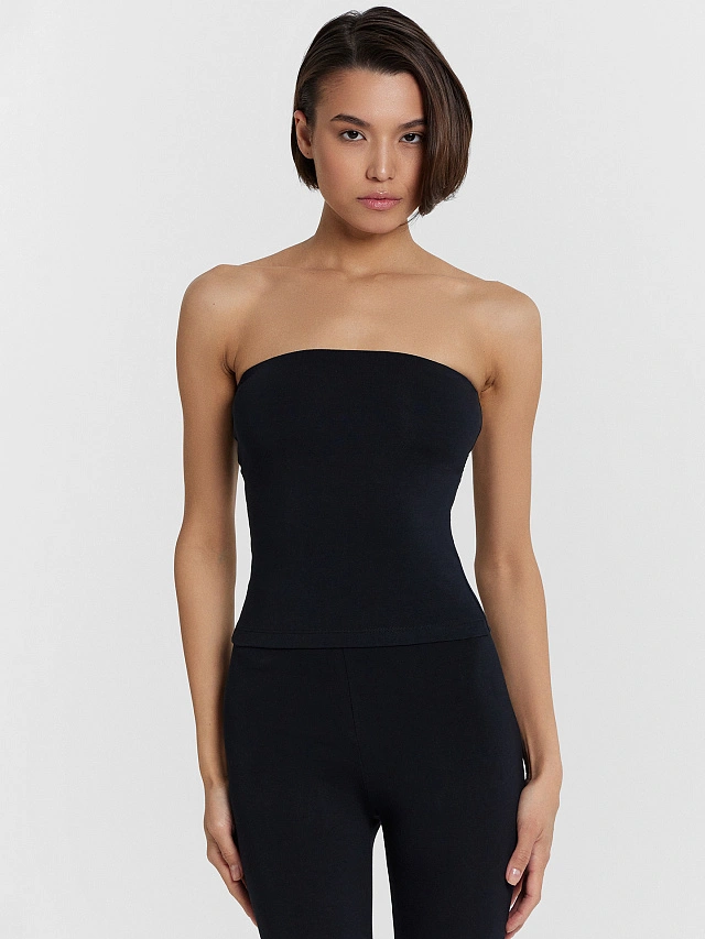 Топ-бандо прилегающего силуэта. Топ на подкладке из основного полотна, по верхнему срезу притачана эластичная тесьма c силиконовым нанесением 11мм (жесткая без/зуба WTWE1-11Si).