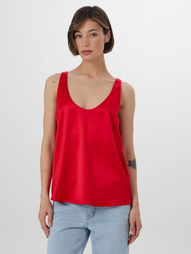 Красная блузка на бретелях — тот акцент, который превращает простой наряд в законченный образ. Свободный прямой силуэт и V-образный вырез горловины создают ощущение элегантности, а струящаяся ткань мягко следует за линиями тела, подчеркивая силуэт без обтягивания.