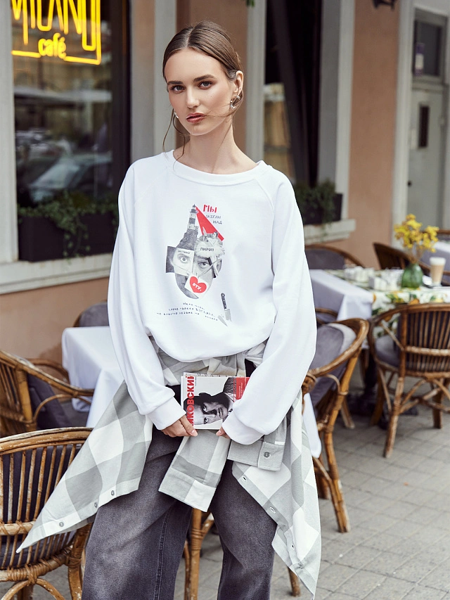 Купить женский свитшот такого фасона — значит обзавестись универсальной вещью, которая станет основой множества образов. Классический белый цвет легко сочетается с джинсами, юбками и брюками, делая его незаменимым в повседневном гардеробе.