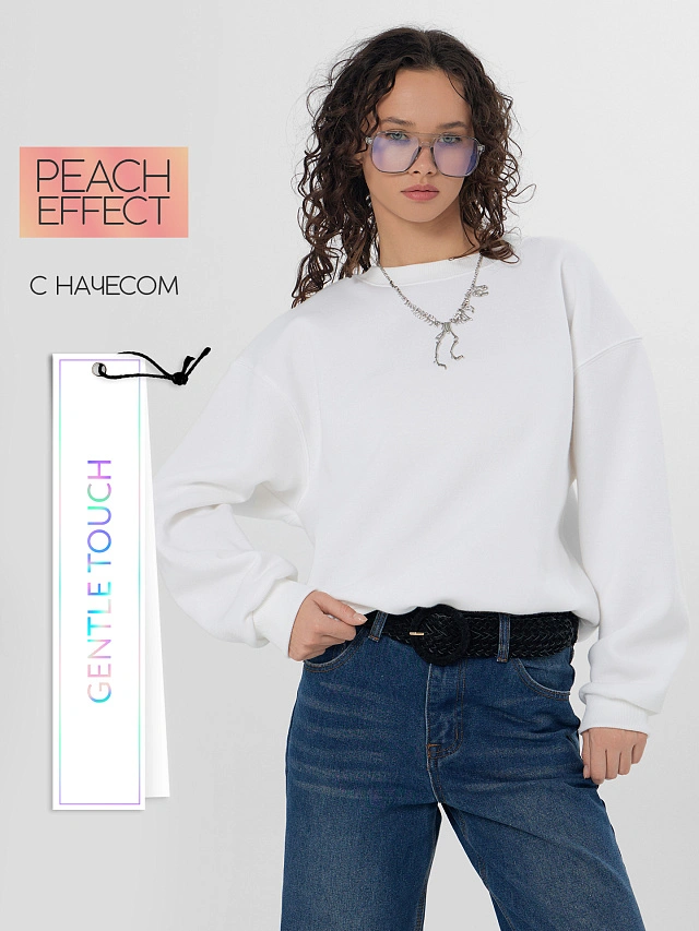 Женский свитшот из коллекции Gentle Touch выполнен из мягкого футера с начесом и пич-эффектом, который создает бархатистую поверхность и приятные ощущения при контакте с кожей.