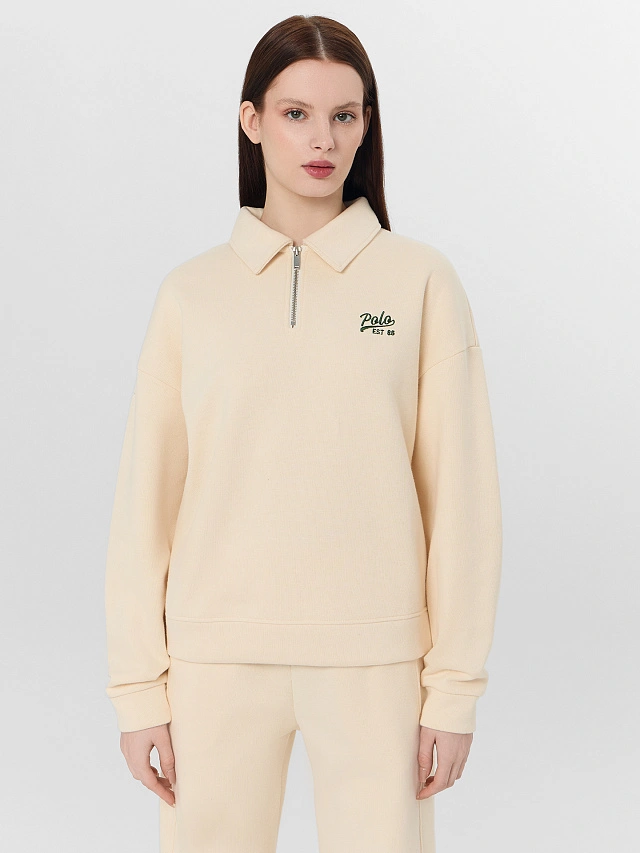 Молочный женский джемпер с застежкой-молнией — это уют и практичный стиль для повседневной носки. Он выполнен из мягкого селаника — трикотажа с лёгким ворсом, который обеспечивает тепло, комфорт и хорошо сохраняет форму.