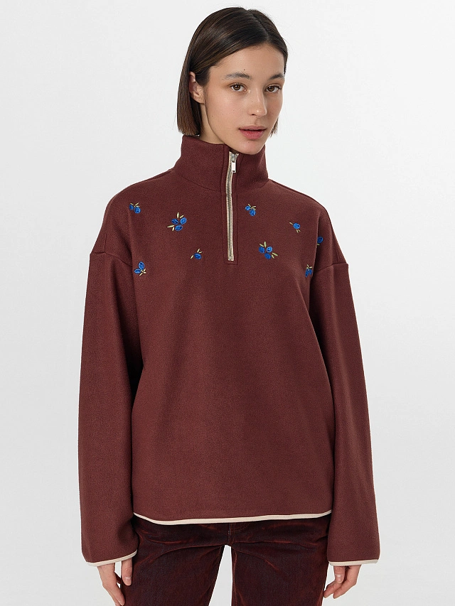 Женская толстовка из мягкого флиса станет уютным дополнением вашего гардероба. Свободный крой с круглой горловиной и стойкой обеспечивает комфорт в течение всего дня. Застежка-молния по центру и мягкие спущенные плечи создают расслабленный силуэт, не сковывающий движений.