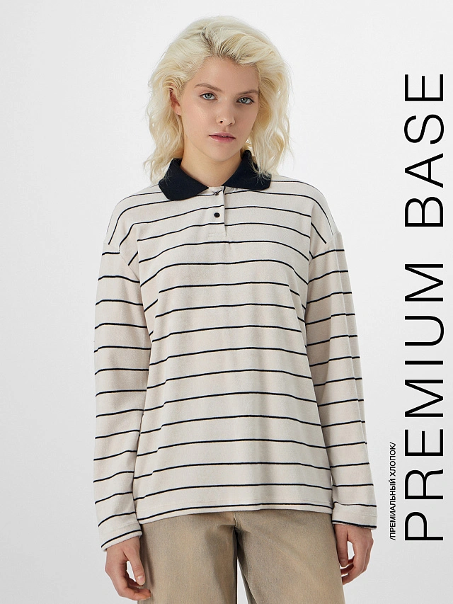 Бежевое женское поло в полоску из коллекции Premium Base — это вещь для тех, кто ценит комфорт. Оно выполнено из мягкого велюрового хлопка с бархатистой поверхностью, которая нежно прилегает к телу. Свободный прямой силуэт, спущенное плечо и длинные рукава создают элегантный и расслабленный вид.