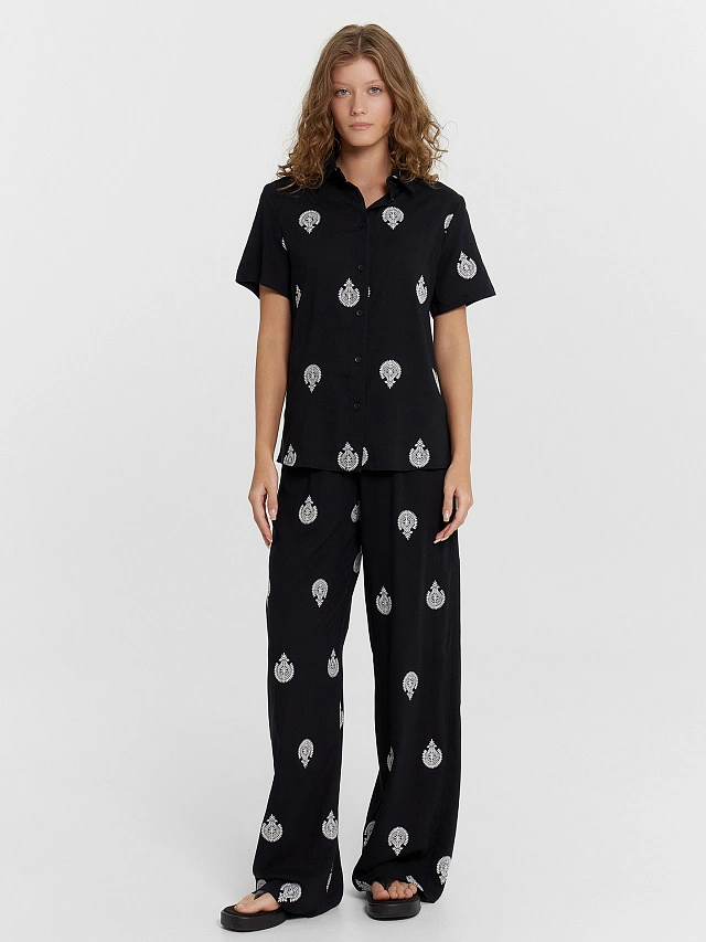 Женский комплект создан для максимального комфорта в повседневной носке. Натуральные материалы — вискоза и лен — обеспечивают хорошую воздухопроницаемость, приятны к телу и дарят легкость даже в жаркую погоду. Они устойчивы к износу, легко стираются и сохраняют аккуратный вид длительное время. Практичный дизайн делает комплект удобным в любых ситуациях. Свободные прямые брюки со средней посадкой и эластичным поясом обеспечивают комфортную посадку, а боковые карманы добавляют функциональность. Укороченная рубашка полуприлегающего силуэта с застежкой на пуговицы подходит как для повседневных образов, так и для более стильных сочетаний. Этот комплект — идеальный вариант для тех, кто ценит удобство, качество и натуральные материалы.