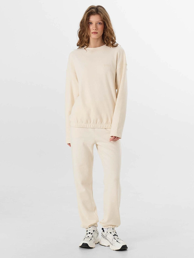 Свитшот свободного кроя со спущенным плечом обеспечивает непринужденную посадку. Перед и спинка цельнокроеные, что создает гладкие линии без лишних боковых швов. Круглая горловина аккуратно обработана, а низ изделия и длинные рукава дополнены поясом и манжетами с широкой эластичной тесьмой для удобной фиксации.