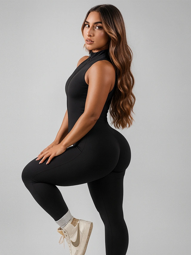 Женский спортивный комбинезон для фитнеса — идеальное сочетание продуманного кроя и функциональности. Облегающий силуэт с высоким воротником-стойкой повторяет естественные изгибы тела, обеспечивая максимальную свободу движений без скованности.