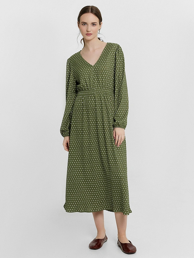 Элегантное длинное платье Mark Formelle станет стильным и универсальным дополнением вашего гардероба! Модель полуприлегающего силуэта сочетает в себе комфорт и изысканный дизайн, подходящий для различных случаев. Платье имеет V-образный вырез горловины, который подчеркивает линию шеи и декольте, добавляя нотку изящества. Эластичная сборка на талии создает акцент на фигуре, а длинные рукава с эластичной сборкой по краю придают нежности и утонченности. Расширяющийся к низу крой добавляет грациозности и движения, создавая великолепный силуэт. Изделие выполнено из ткани рашель, известной своей легкостью и эластичностью. Такой материал отличается нежностью и изысканным внешним видом, что делает его идеальным для создания элегантных и комфортных нарядов. Это платье станет удачным выбором как для повседневных образов, так и для торжественных мероприятий, подчеркивая ваш стиль и женственность. Рекомендуем!
