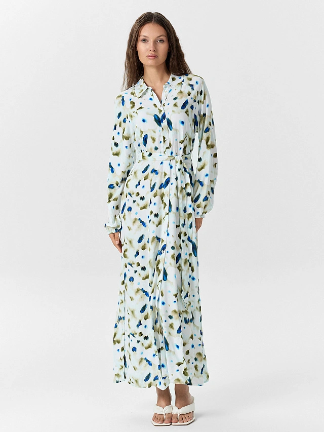 Женское платье-рубашка с цветочным принтом — это воплощение легкости и женственности в элегантном повседневном образе. Миди-длина придает модели утонченность, делая ее подходящей как для прогулок, так и для неформальных встреч. Застежка на пуговицы по всей длине обеспечивает удобство и позволяет регулировать степень открытости — от классического до более расслабленного варианта. Отложной воротник добавляет структурности, а длинные рукава с деликатной сборкой подчеркивают романтический характер образа. Тканый пояс акцентирует талию и придает силуэту легкую выразительность. Вискозная ткань дарит коже мягкость и комфорт, красиво струится и подчеркивает женственные линии. Такое платье можно дополнить сандалиями, балетками или даже кедами — и каждый раз оно будет звучать по-новому.