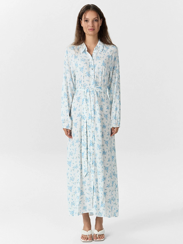 Женское платье-рубашка с цветочным принтом — это воплощение легкости и женственности в элегантном повседневном образе. Миди-длина придает модели утонченность, делая ее подходящей как для прогулок, так и для неформальных встреч. Застежка на пуговицы по всей длине обеспечивает удобство и позволяет регулировать степень открытости — от классического до более расслабленного варианта. Отложной воротник добавляет структурности, а длинные рукава с деликатной сборкой подчеркивают романтический характер образа. Тканый пояс акцентирует талию и придает силуэту легкую выразительность. Вискозная ткань дарит коже мягкость и комфорт, красиво струится и подчеркивает женственные линии. Такое платье можно дополнить сандалиями, балетками или даже кедами — и каждый раз оно будет звучать по-новому.