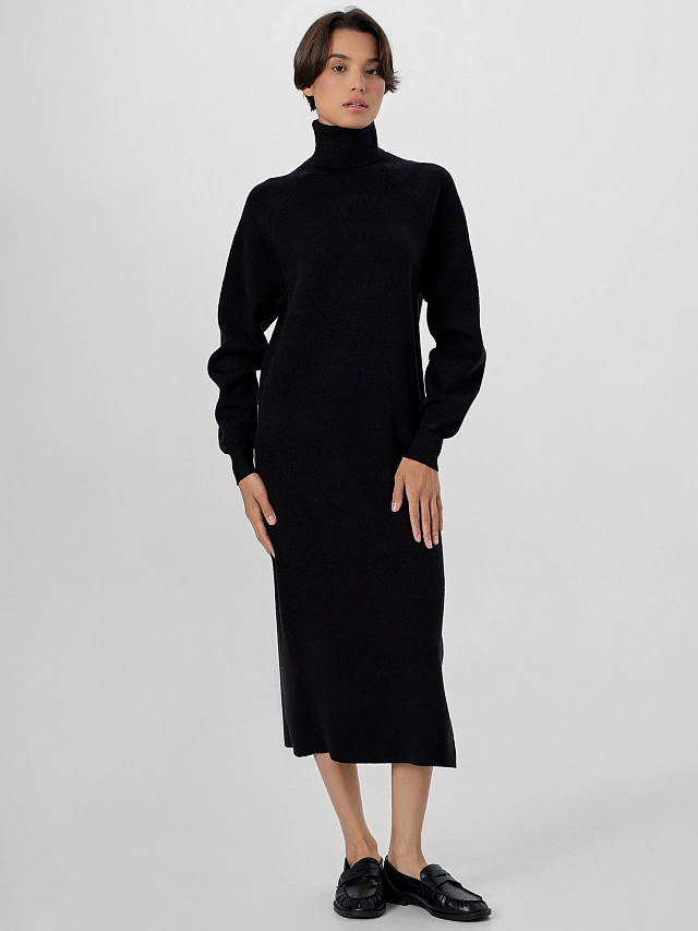 Женское черное платье с длинными рукавами — элегантная модель для прохладного сезона. Высокий воротник-стойка не только эффектно обрамляет шею, но и надежно защищает от холода. Длина ниже колен и рукава, зауженные на манжетах, создают утонченный, вытянутый силуэт. Стильный вырез на левом бедре — вносит в образ ноту современности.