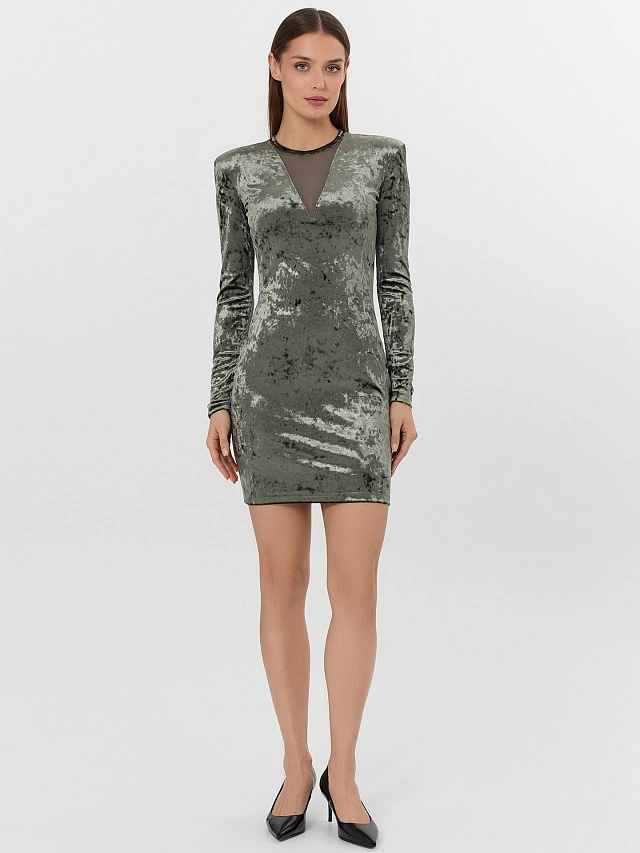 Зеленое велюровое платье создано для особенных выходов. Прилегающий силуэт и короткая длина выгодно акцентируют линии фигуры, создавая выразительный и соблазнительный образ.