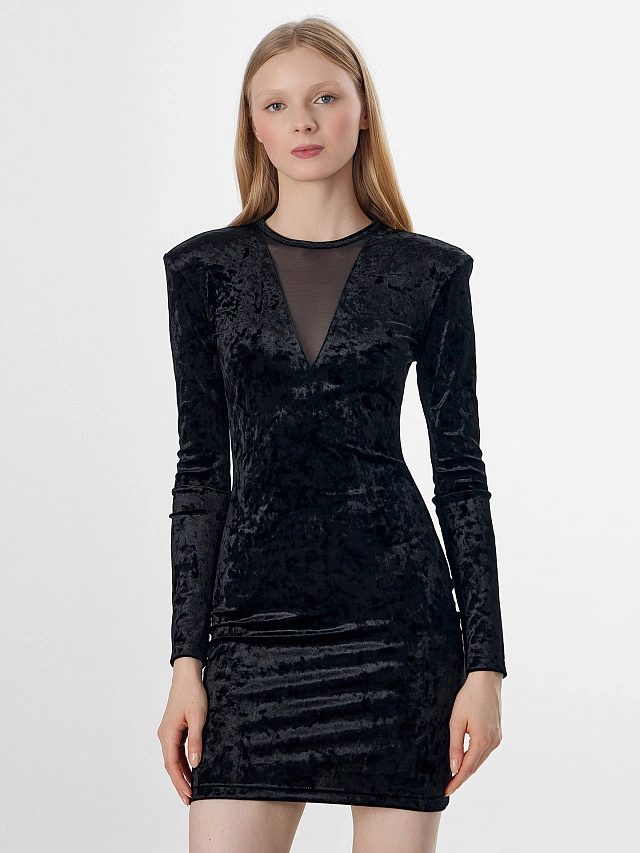 Черное платье создано для особенных выходов. Прилегающий силуэт и короткая длина выгодно акцентируют линии фигуры, создавая выразительный и соблазнительный образ.
