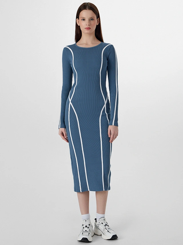 Синее платье прилегающего силуэта с контрастными белыми лампасами создает элегантный образ. Модель выполнена из эластичной рибаны с оптимальным составом: хлопок обеспечивает естественную воздухопроницаемость и гигиеничность, а добавление эластана придает ткани упругость для идеального облегания. Такой состав обеспечивает, что платье не потеряет цвет и форму при активной носке.