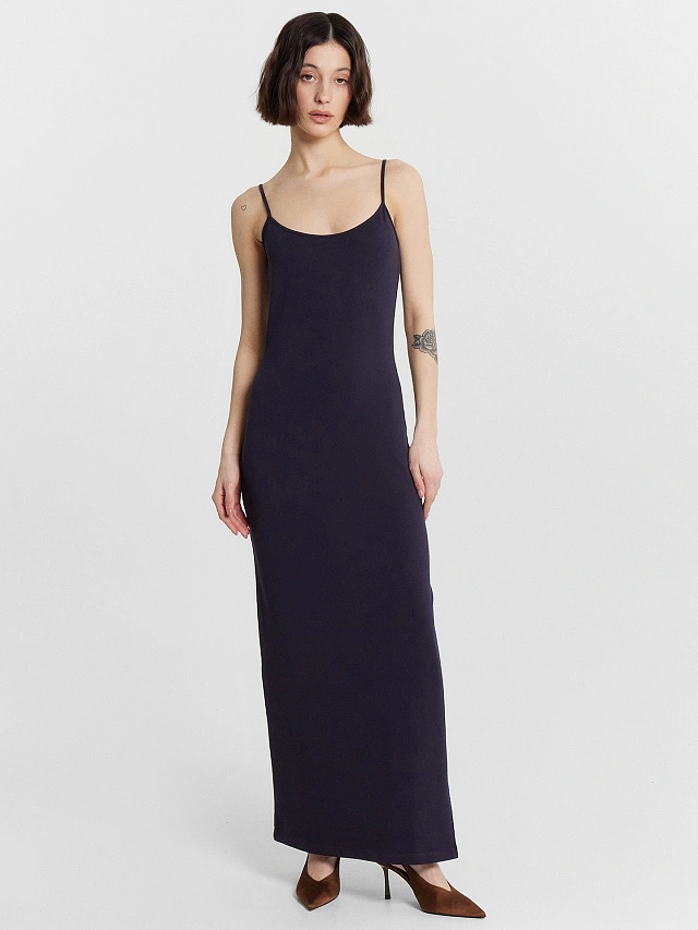 Погрузитесь в мир элегантности с платьем в стиле комбинации, которое подчеркнет вашу женственность и утонченность. Эта модель на тонких бретельках выполнена из мягкого трикотажного футера, обеспечивающего комфорт и отличную посадку по фигуре. Облегающий крой создает изящный силуэт, а круглая горловина добавляет лаконичный штрих к общему образу. Элегантный разрез в левом боковом шве придает платью нотку утонченности и делает его идеально подходящим для особых случаев или романтических вечеров. Макси-длина позволяя сочетать модель с различной обувью и аксессуарами для создания неповторимого стиля. Это платье станет вашим надежным спутником для ярких и запоминающихся моментов!