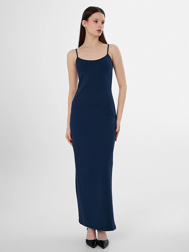 Сарафан имеет прилегающий крой, округлую горловину и аккуратную отделку края горловины и пройм. Разрез в левом боковом шве добавляет свободы движений и лёгкую динамику. Длина макси делает сарафан универсальным вариантом для создания разных образов. Его можно носить самостоятельно или в многослойных комплектах, сочетая с футболками, рубашками или лёгкими джемперами.