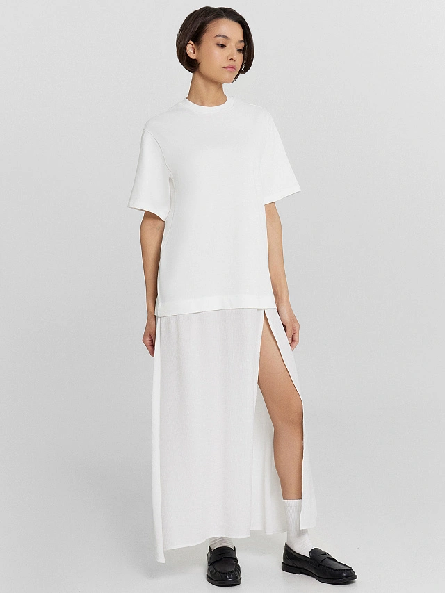 Платье женское свободное прямое платье миди — прекрасный выбор для повседневных и стильных образов. Классическая круглая горловина обработана обтачкой из рибаны, что добавляет аккуратность и долговечность. Короткие рукава обеспечивают свободу движений, а продуманная посадка делает модель удобной для любого типа фигуры. Главный акцент дизайна — юбка, выполненная из текстиля «жатка», который придает образу легкость и изящность. Отрезная линия по бедрам подчеркивает силуэт, а стильный разрез спереди добавляет нотку женственности и динамичности. Платье выполнено из хлопка с добавлением района и небольшого количества искусственных волокон, что делает его прочным, удобным и устойчивым к износу. Ткань дышащая, приятная на ощупь и комфортная для повседневной носки. Идеальный выбор для тех, кто ценит стиль, удобство и универсальность. Сочетайте его с любимыми аксессуарами и обувью, создавая индивидуальный образ на каждый день!