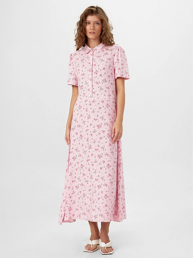 Женское миди-платье — воплощение элегантности и утонченного стиля, созданное для тех, кто ценит изящные силуэты и комфорт. Приталенный крой подчеркивает фигуру, создавая женственный образ, а расклешенная книзу юбка добавляет легкость и динамику в движения. Классический отложной воротник придает нотку строгости, делая модель универсальной как для будней, так и для особых случаев. Короткие рукава уравновешивают силуэт, добавляя легкости и идеально подходя для теплого времени года. Застежка на пуговицах не только удобна, но и служит стильным акцентом, дополняя общий образ. Изделие выполнено из вискозы — мягкого, дышащего материала, который приятно ощущается на теле и обеспечивает комфорт в течение всего дня. Это платье идеально подходит для прогулок, офисных будней, встреч с друзьями и романтических вечеров. Стильно, женственно и практично — базовая вещь, которая станет украшением любого гардероба.