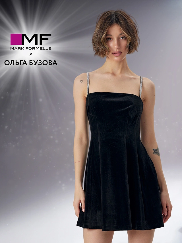 Черное новогоднее платье из лимитированной коллекции Mark Formelle x Ольга Бузова создано для праздничной ночи. Модель с тонкими шлейками, украшенными стразами, подчеркивает женственность и добавляет образу сияния. Короткая длина делает силуэт легким и динамичным.