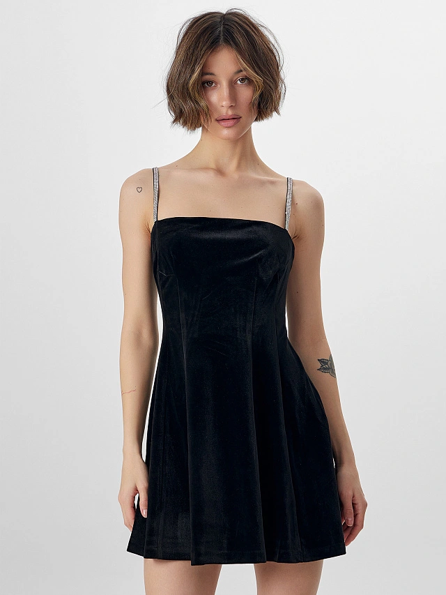 Черное платье создано для особых моментов в повседневной жизни. Модель с тонкими шлейками, украшенными стразами, подчеркивает женственность и добавляет образу сияния. Короткая длина делает силуэт лёгким и динамичным.