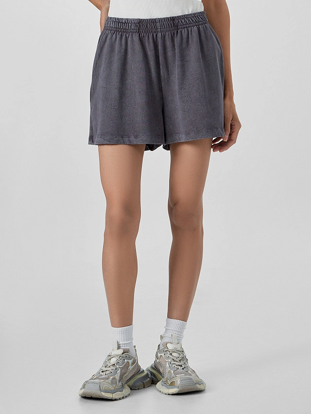 Короткая длина и высокая посадка визуально удлиняют ноги, а свободный силуэт обеспечивает комфорт в течение всего дня. Эластичный пояс мягко фиксирует шорты на талии. В боковых швах расположены удобные карманы, а накладной карман сзади добавляет модели нотку уличного стиля. Шорты выполнены из натурального хлопка, который отличается мягкостью и воздухопроницаемостью, обеспечивая комфорт даже в жаркую погоду. Их можно носить не только на улице, но и дома — они идеальны для отдыха или неспешных дел благодаря своей легкости и непринужденному крою. Этот универсальный предмет гардероба легко сочетается с майками, топами и рубашками для создания стильных образов.