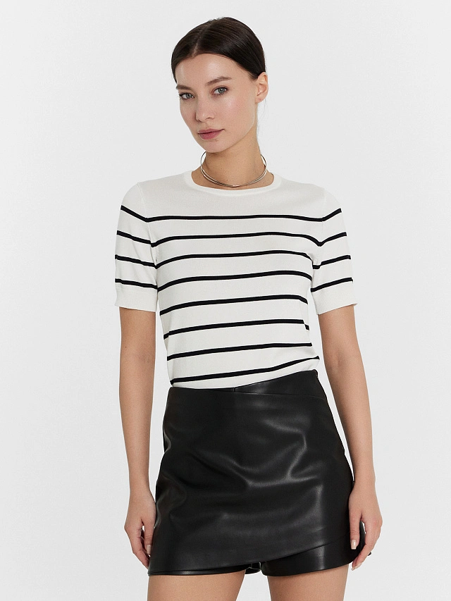 Этот женский джемпер с короткими рукавами и круглым вырезом горловины станет идеальным дополнением вашего гардероба. Изделие выполнено из нежной вискозы, что придает ему особенно мягкую и приятную на ощупь текстуру. Вискоза также обладает отличной воздухопроницаемостью, что делает изделие комфортным для носки в любое время года. Комбинируйте его с брюками, джинсами или юбками для создания стильных и уютных образов.