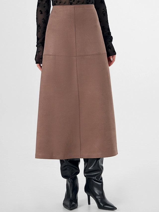 Стильная юбка женская а-силуэта из трикотажного полотна "под замшу". Пояс цельнокроенный, обработан обтачкой из основного полотна. адняя и передняя детали с центральными и поперечными членениями. Боковые швы с отделочными строчками. На задней детали вытачки и застежка на потайную молнию. Низ юбки подогнут на клеевую паутинку. Модель длиной ниже колена. Широкий размерный ряд. Рекомендуем для создания лаконичных образов!