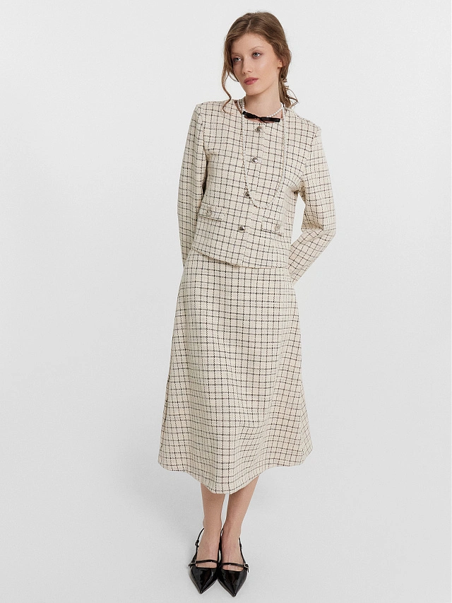 Откройте для себя элегантную миди-юбку для женственных образов! Модель А-силуэта с потайной застежкой-молнией на спинке выполнена из трикотажного материала академик, обеспечивающего комфорт и стиль. Верхний и нижний срезы изделия обработаны швом вподгибку, добавляя изделию изысканности и долговечности. Эта юбка станет идеальной основой для создания утонченных и женственных образов. Дополните её подходящим жакетом из этой же коллекции, и ваш образ будет безупречным.