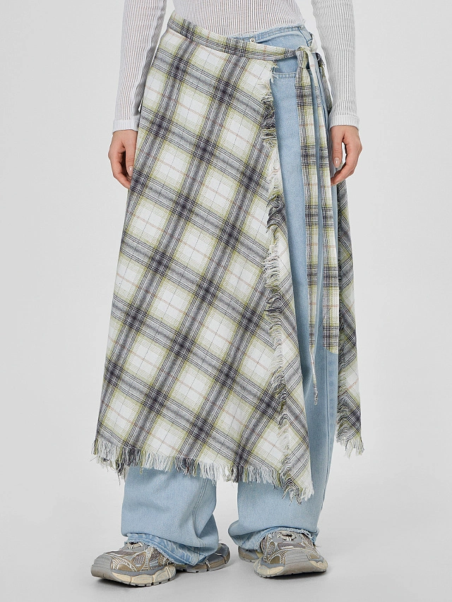 Женская юбка миди в бежево-серую клетку с эффектными необработанными краями. Модель с запахом крепится на регулируемые завязки, позволяя точно настроить посадку по фигуре. Отрезной пояс можно завязать разными способами — от строгого узла до свободного банта, создавая нужный силуэт.