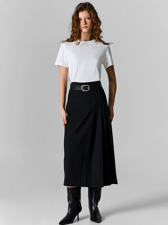 Эта юбка станет ключевым элементом базового гардероба. Она безупречно сочетается с классическими блузами, лаконичными топами, строгими жакетами или объёмными свитерами, позволяя создавать множество образов — от безупречно деловых до современных минималистичных.