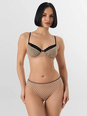 Бежевый женский кружевной бюстгальтер — это элегантность и комфорт в каждой детали. Он выполнен из сочетания эластичной сетки и нежного кружева, что создает изысканный внешний вид и обеспечивает мягкое облегание.