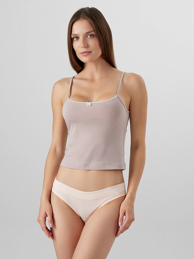 Горловина переда и спинки с изящным вырезом обработана эластичной тесьмой, которая сохраняет форму и предотвращает растягивание. Низ топа аккуратно подогнут и прострочен для аккуратного вида. Декор в виде миниатюрного бантика по центру спереди добавляет модели нежности и легкости.