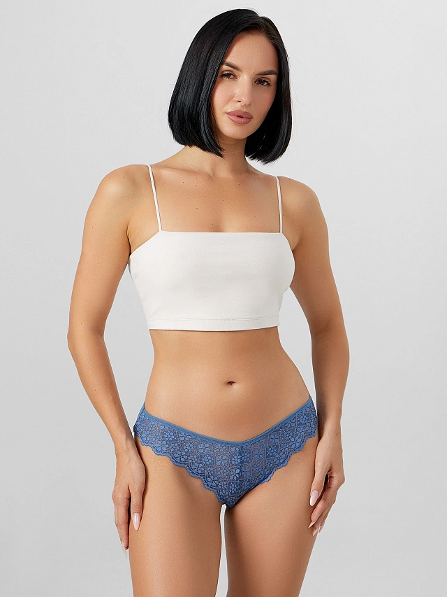 Синие кружевные трусы-бразилиана — это элегантность и комфорт в каждой детали. Модель выполнена из эластичного кружева и мягкого трикотажа, которые обеспечивают идеальную посадку и нежность к коже. V-образный силуэт со средней высотой талии мягко подчеркивает изгибы, создавая женственный образ.